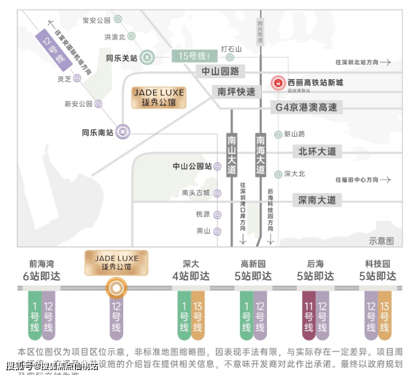 项目拥有“3地铁+3枢纽+2纵4横路网”的多维立体交通体系,通勤效率与出行便捷度兼具。已运营的地铁12号线分钟即可抵达,乘坐该线分钟可达科技园核心区,5站约15分钟覆盖高新园,无缝衔接南山科创核心板块。在建的地铁15号线月开通,作为深圳“一环线”,未来将串联宝中、前海、深圳湾、西丽等核心区域,进一步拓宽出行辐射范围;规划中的24号线站可直达高新园,强化与科技产业带的紧密连接。枢纽方面,项目距离在建的西丽高铁站约2.3公里,预计2028年建成通车后,1小时可抵达广州、东莞等大湾区城市;临近宝安国际机场(约15公里)和深圳湾口岸(约10公里),满足商务出行与跨境需求。路网规划上,依托“2纵4横”交通动脉,2纵即中山园路链接南山大道、南海大道,4横包括京港澳高速、南坪快速、北环大道、深南大道,自驾15分钟可覆盖福田中心区、宝安中心区等区域,至科技园约12分钟,前海约18分钟,留仙洞总部基地约10分钟,高效衔接城市各大核心板块。